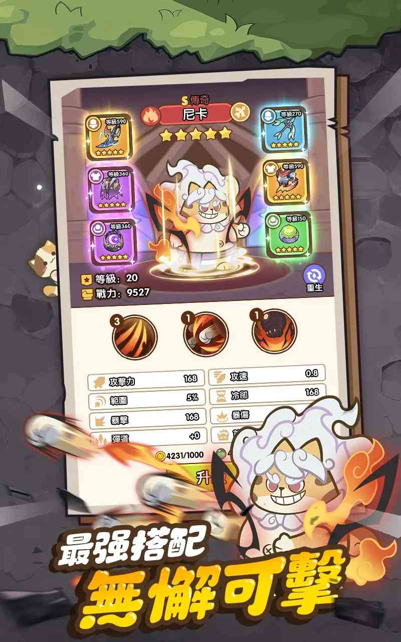 1、 丰富的猫咪英雄:每只猫咪都有独特技能,随心培养,提升战力,构筑专属高塔,好吧...。