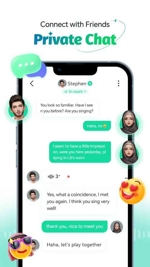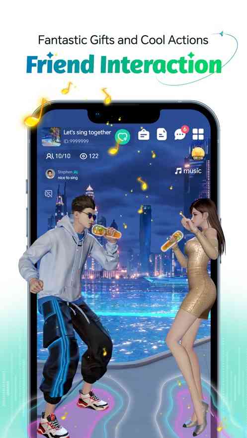 “社交语音”:加入房间与好友语音聊天 一起唱卡拉OK,交换礼物,享受无尽的刺激。添加好友并发送私信,进行更深入的沟通和互动。