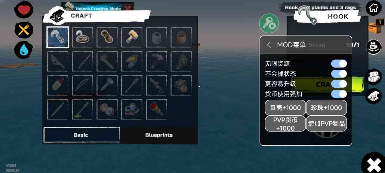 木筏求生破解版内置功能菜单, 破解了无限资源,这是一款冒险生存游戏,玩家将漂泊于一座海岛之上,仅仅只有木筏和一个小钩子,通过这两个简约的道具想办法去获得更多的物资,这款游戏十分考验荒岛求生技能,有兴趣的小伙伴就来体验一下吧。