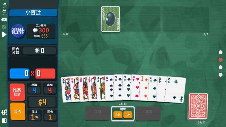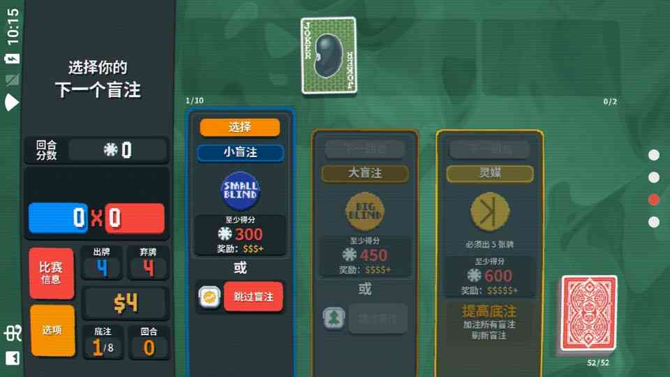 - 阴险小丑:如果出牌中包含一个顺子,+100筹码