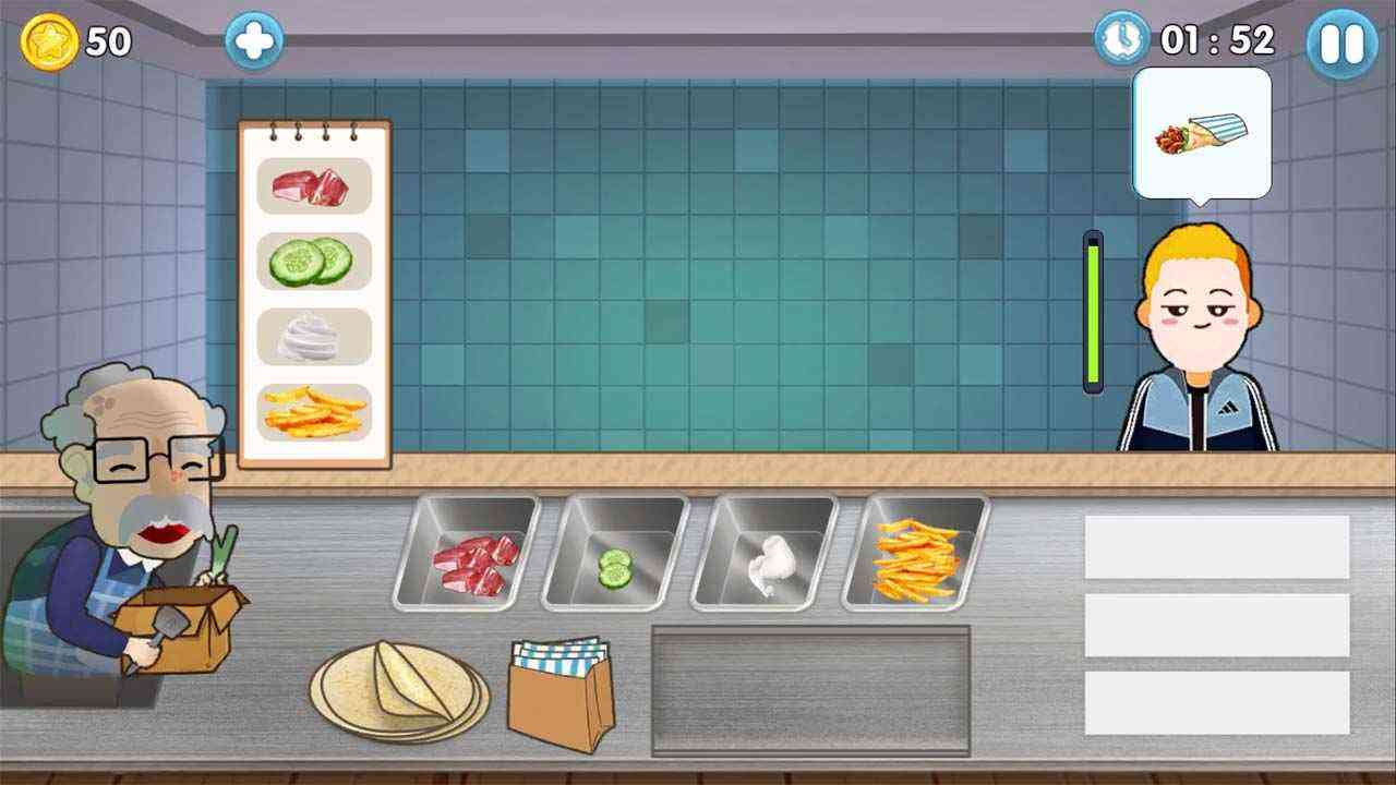 沙威玛传奇小店游戏整体画面比较贴近现代风格, 仿照沙威玛游戏老头的设计以及原材料的补充方式,游戏整体没什么新意,重复制作食物,但在游戏当中顾客食欲挺好,大体上都是要两个,库库就是一顿点,库库给他们进行打包。但是在这款游戏当中卷饼的方向略有不同,是需要从右边开始卷。
