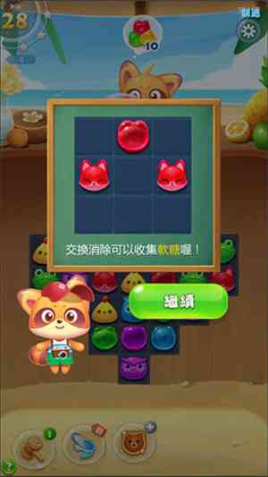 1、 开局进图后系统会弹几条小提示,告诉你同过交换相邻元素完成消除就嫩攒软糖,这些软糖就是本关要凑齐的通关指标,别怕...。