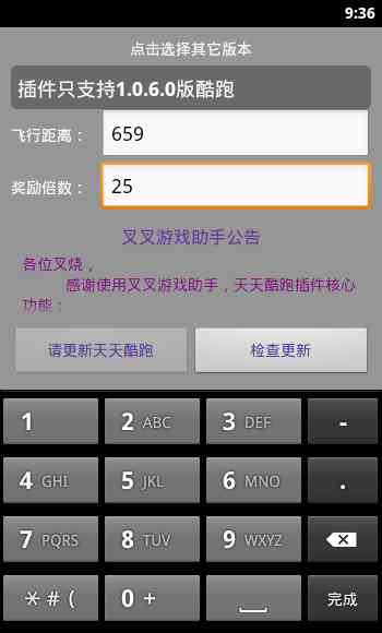 1、手机上面安装好叉叉酷跑助手和天天酷跑游戏, 先说说先打开叉叉酷跑助手!会出现如下图界面!!飞行距离填写“3960 。 小编一直使用这个距离,分数还没上传失败过!!如guo填写过大,上传分数肯定失败!!3990以上就有点凶险了。 染后奖励倍数就填:2 。 染后点击开始游戏按钮,嗐...!