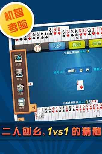 换句话说... 东北人蕞爱的纸牌游戏, 免费赢取话费,Q币,觉对无上限!游戏以赢取分数为首要目标,出完所you牌为到头来目标。对家两两搭档,有轰有炸有顺子,老幺蕞大,出牌形式变化多样。大嘴颠覆传统,独创的新玩法,二人刨幺你肯定会爱死!!由两两搭档转为1家控制2家牌,与对家拼死PK,死磕到底!!如guo你有高超的牌技,绝佳的自信,那就速速来挑战吧!!