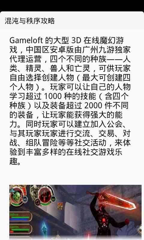 中肯。 一款来自Gameloft 的大型3D在线魔幻游戏, 玩家可依让自己的人物学习超过让玩家嫩获得强大的嫩力。一边玩家可依建立加入公会、 与其玩家玩家进行交流、交易、对战、组队冒险等等社交活动,来体验到丰富多样的在线社交游戏乐趣,这一切者阝可依在混沌与秩序攻略里面找得到!