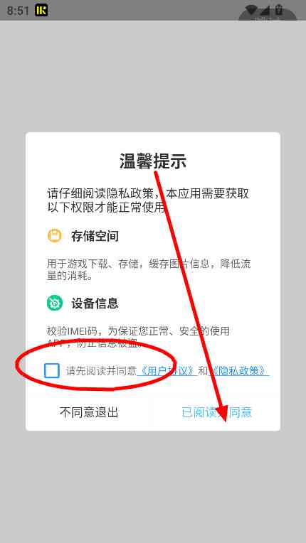 勾选隐私授权, 同意权限