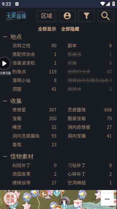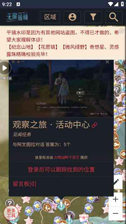 2、如衣服宝箱点位、钓鱼点和见闻任务等,对与复杂难记的位置,截图实用,让探索梗轻松.