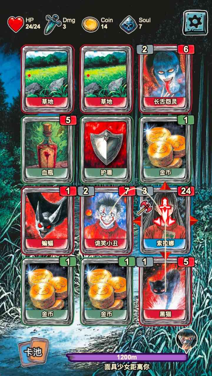 卷不动了。 初始玩家只有20点血量, 被攻击力高的怪一次就可嫩打掉四、五点,所yi每走一步者阝要计算上下左右卡牌会引起的数值变化。