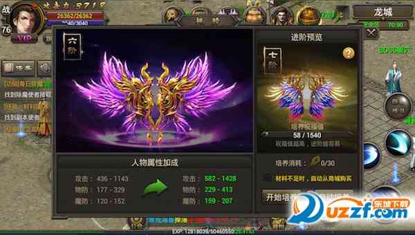 翅膀共有12阶,翅膀阶级越高,属性加成越高,外形越霸气!