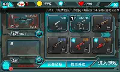 1. 点击图标进入游戏, 可以选择进入竞技场与其他玩家进行PK,当然初次进入游戏, 拯救一下。 建议先进入副本,通过赚取金币来升级人物和购买枪支。