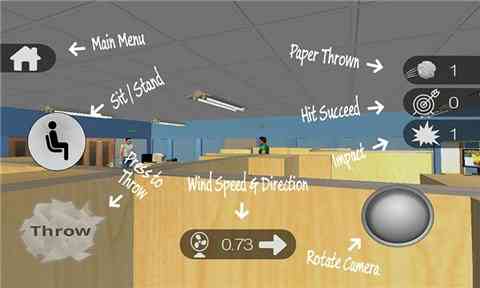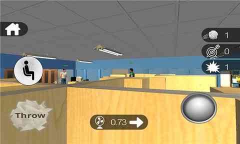 在游戏中, 当你老板出门办事的时候,整个公司仿佛瞬间释放了所有压力,大家开始疯狂地互相扔纸团,享受着办公室的乐趣。你当然也不会例外加入这场欢乐的战斗,让纸团来得更猛烈些吧!但别忘了游戏规则可是很严格的,当你被纸团击中10次时你就得退出这场战斗了。快来发泄你的情绪,释放你的压力吧!