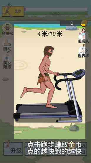 这家伙... 2、 游戏里头夸父在跑步机上练跑步,最基础的机器跑10米就给金币,你手指头点屏幕越快,夸父两条腿倒腾得就越快。