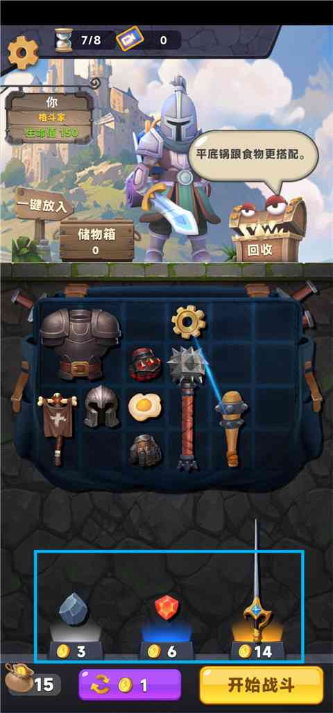 1、 进入游戏后在下方三个物品中选择一个放入背包内。