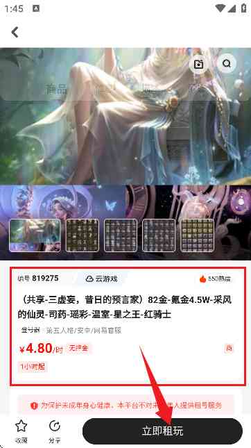6、 来到详情页可以查询账号相关信息,觉得合适可以马上租玩,瞎扯。。