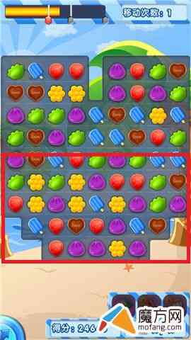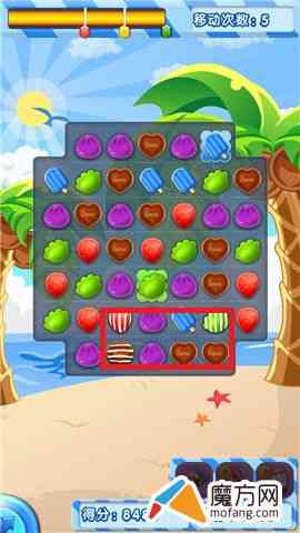 先消除下方的可以对上方的进行一个小范围洗牌, 区域调整有利于之后的消除,算是为后面做一个铺垫。
