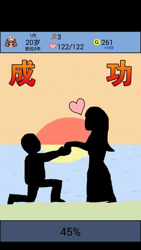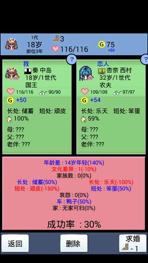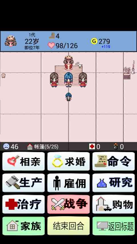 游戏中呢,你是一个没落王国的王子,为了重建家园,你需要到处勾搭异性,相亲需要金币和行动值,越贵的相亲地点,血统越好,然后完成造人,还可以为你的孩子们安排职业。需要经常出门打仗赚钱,雇佣仆人,征讨其他国家。当然如果你失败了,老婆孩子就是其他王国的啦。