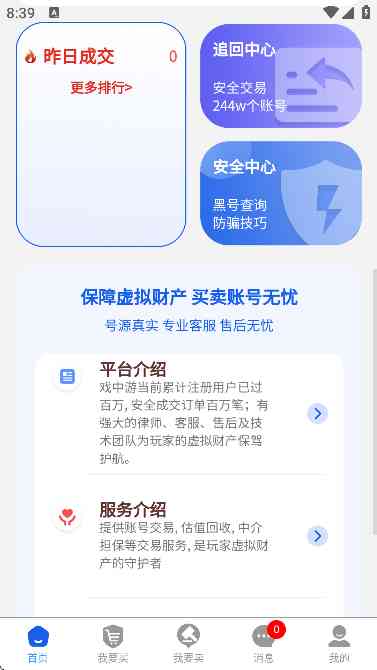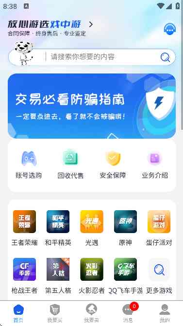 2、进入到软件首页,如图所示。这里能提供大量游戏类型的账号资源,以及一些回收代售等业务入口。