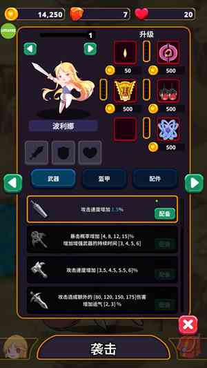 换言之... 3、 点击右下角背包选项,在这里你可以为角色装备获取的各种武器与盔甲,一边还可以为角色的弹幕以及被动属性进行升级。
