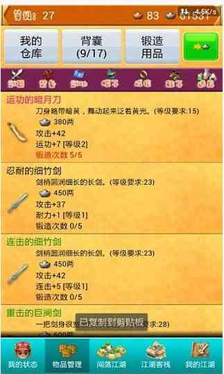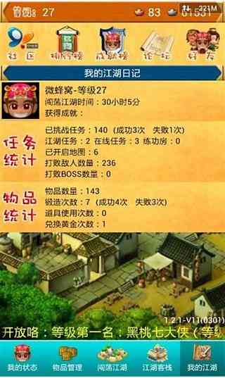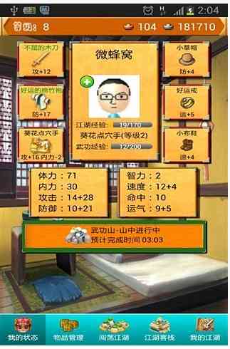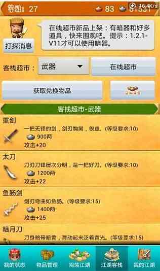 这东西... 菜鸟闯江湖放置型RPG, 无需传统RPG漫长的打怪升级过程,只需简单的购买装备、带上药品、配置武功,就能让你闯荡江湖,挑战武林十大门派,寻找传说中的神兵神甲,修炼绝世武功,快来试试看吧。