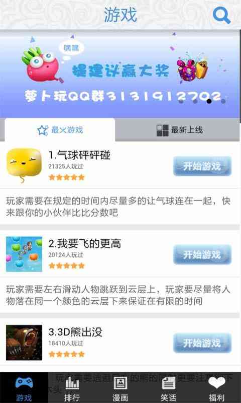 “萝卜玩”是集多人联机互动游戏大厅、在线小游戏、漫画段子的娱乐中心游戏社区。