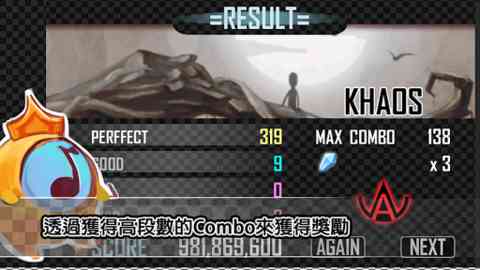 Khaos是一款音乐节奏游戏,搭配音乐所出现的按钮只要配合节奏点击萤屏就可以进行游戏,直觉而且简单!非常容易上手!