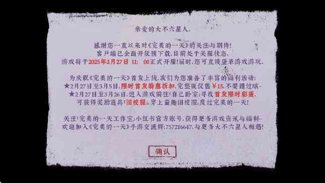 摸个底。 完美的一天是一款剧情故事相当精彩的休闲游戏, 在小编看来这款游戏非常具有复古色彩,主要原因是游戏的故事背景游戏设定在1999年12月31日即上世纪的再说说一天。玩家将扮演一名12岁的小学六年级学生, 在学校突然放假的这一天闯入大人的世界,经历一段特别的成长故事。游戏中的场景和物件充满了90年代的特色,如电视中的雪花、撕页式的日历等,能勾起玩家的怀旧情绪。