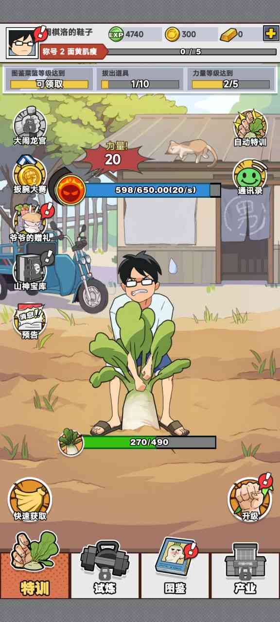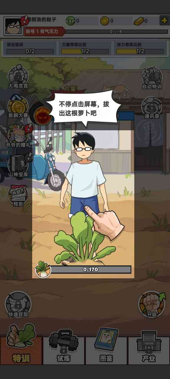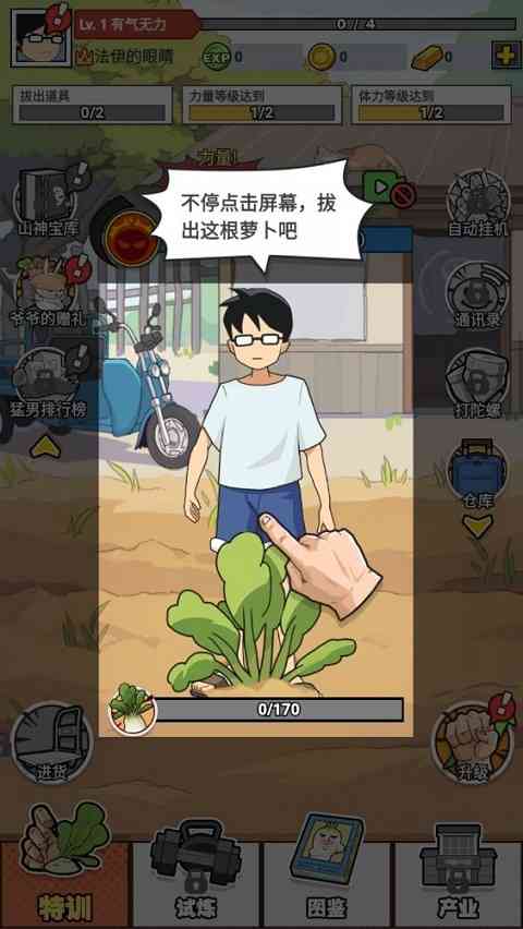 猛男的正义拔萝卜小游戏, 这款游戏的玩法是经典的Ohayoo游戏设计,就是通过看广告做任务来不断的增加玩家这个角色利器, 给力。 来拔出更多更大的萝卜,没有什么具体的意义,主打的就是一个游戏,娱乐。