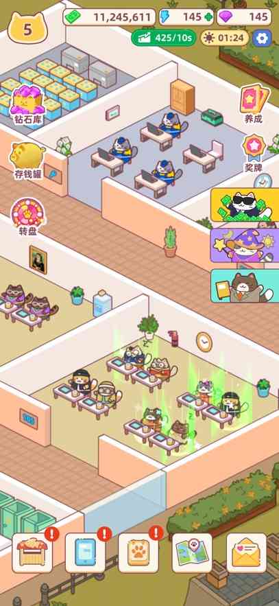 打工喵打工魂,超多打工喵等着你给他们安排职位呢?解锁更多的办公区域, 解锁更多的职位,扩大公司的规模,让更多的搬砖猫给你打工,也许现实生活中你是一个搬砖人,但是在游戏里面这些猫咪成了搬砖猫,可爱的猫咪也要辛苦工作。