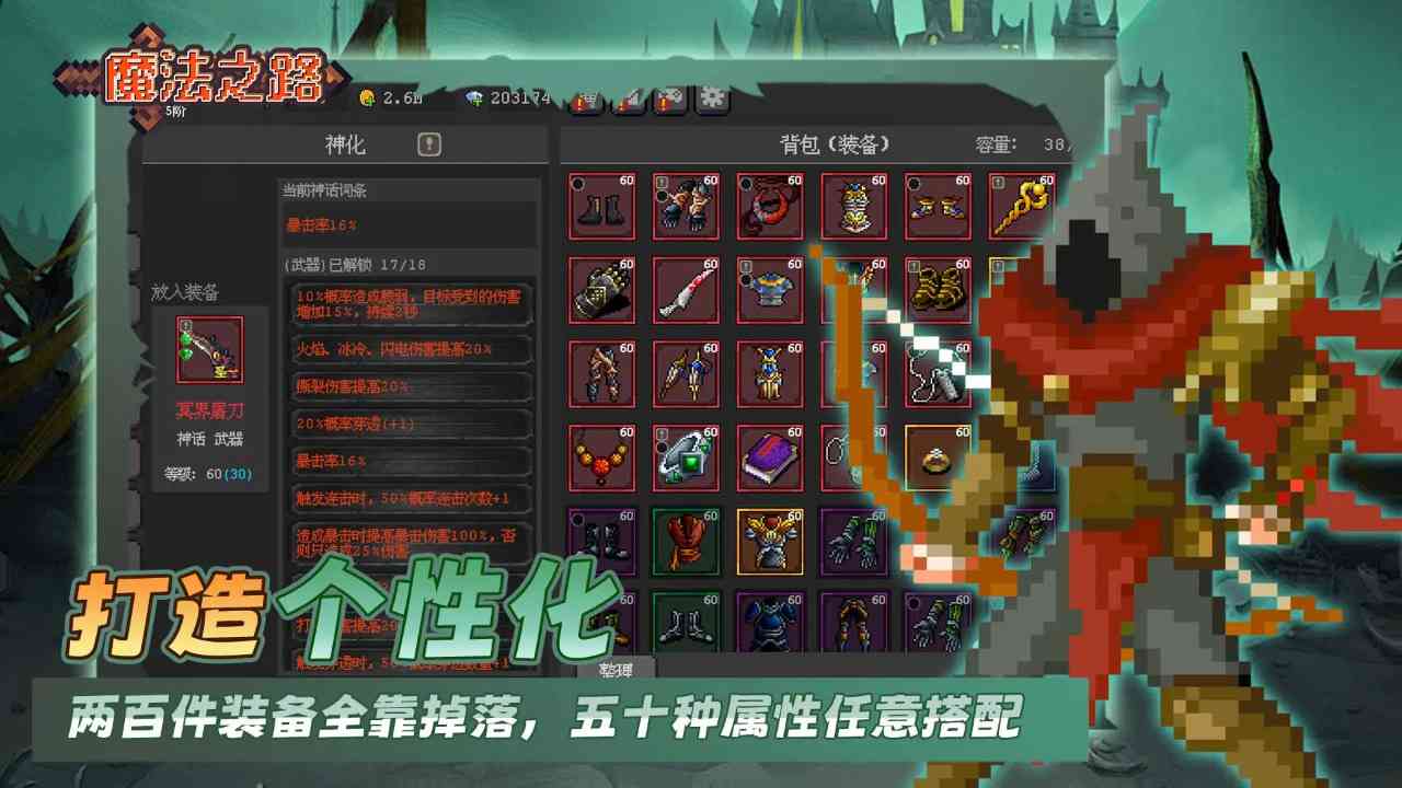 √千变词缀装备库:每件掉落装备自带3-6条随机属性, 从"吸血暴击"到"元素连锁",200+词条组合创造无限可能