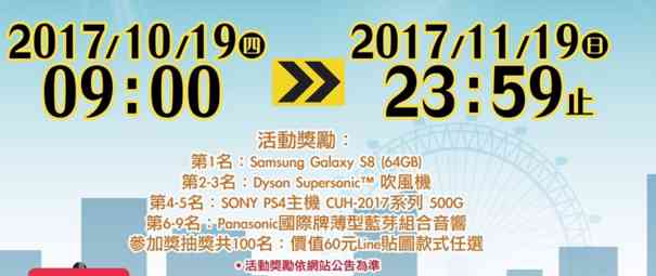 4.10月19日至11月19日期间,参加「奇萌籽GO!道路平安电竞奖金争夺赛」,并下载《奇萌籽GO!》APP, 登录「排名模式」即可参加Line贴图抽奖,竞赛排名最高的前9名可依名次获得新台币25,000至5,000元的等值奖品,奖项包括Samsung Galaxy S8 、SONY PS4主机、Dyson吹风机、Panasonic国际牌薄型蓝芽组合音响等大奖,呵...。