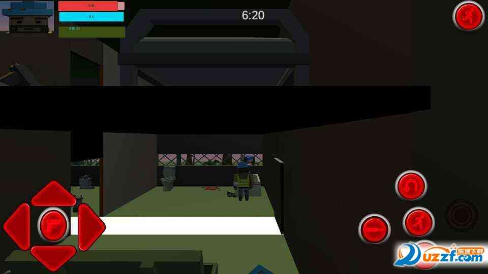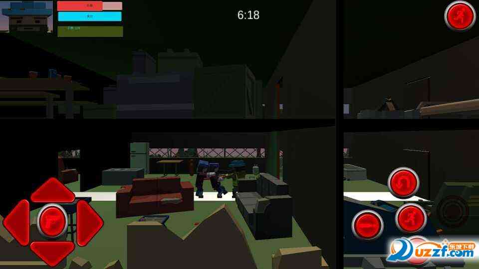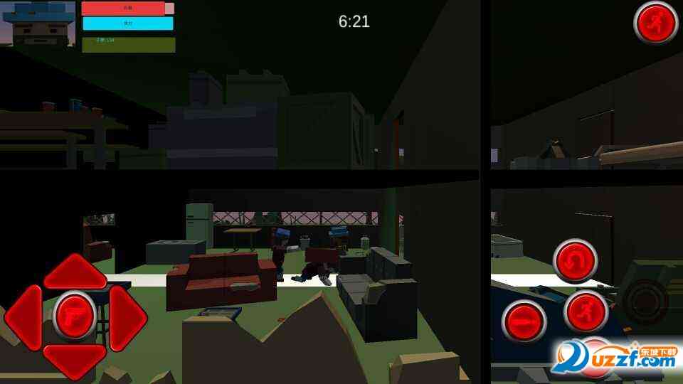 游戏中, 按钮控制角色的前后左右移动以及关门开门,搜索家具,拾取子弹,长按跑动以及跑的时间过久会停下休息,需要重新恢复按下恢复按钮五下重置,手枪和冲锋枪伤害不一样,子弹消耗也不一样,尽量活着,有不足的地方后续制作将会继续完善。