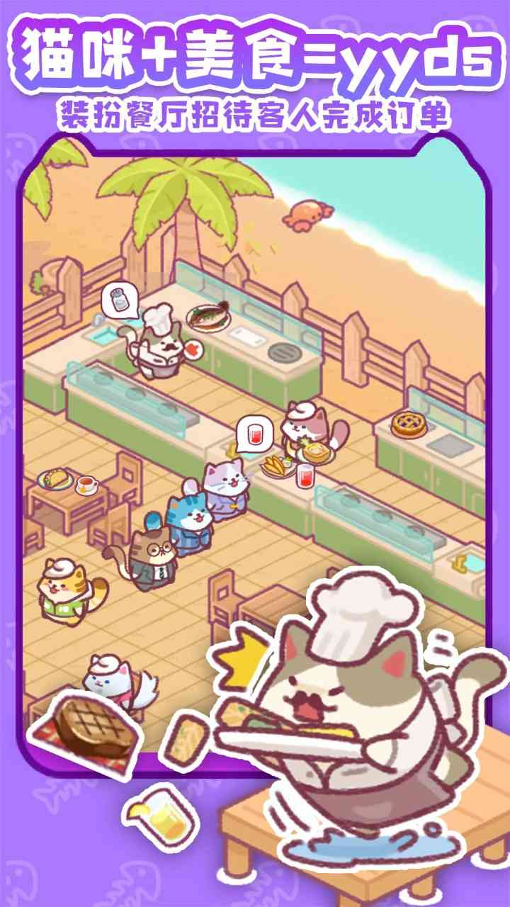 PUA。 在这款游戏中,你一定能玩出前所未有的新鲜感!比如 让猫咪穿上厨师服来煮饭,还能亲自监督它们的工作状态;又或者,你可以用高科技的运输工具,把海鲜产品快速送到客人的手中,顺便还能揪出那些偷懒的"猫奴"。 只要你肯动动脑子,这群喵星人一定会让你玩出各种新意。