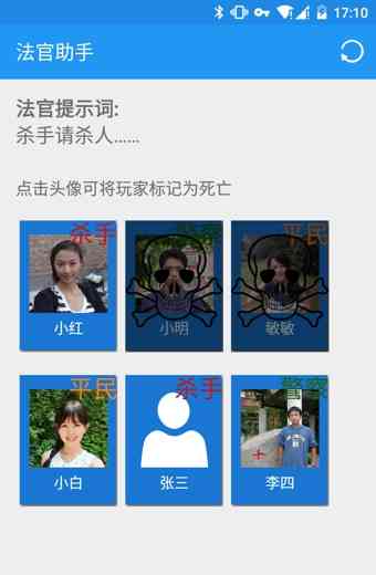 杀人游戏手机版是一款根据现实中的杀人游戏的辅助休闲游戏。单机版的杀人游戏法官助手,让无需纸笔也能和朋友们立刻开始游戏,谨记...。