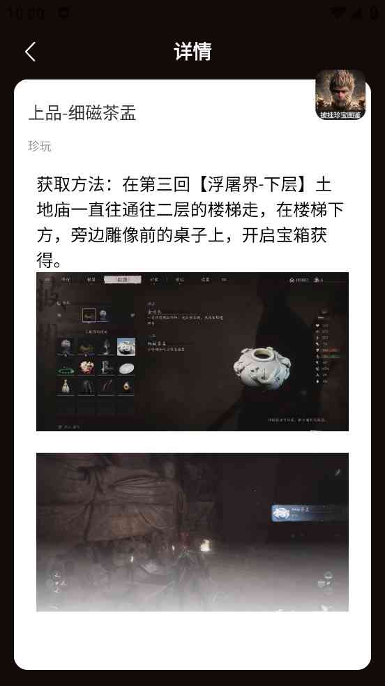 黑神话悟空披挂珍宝图鉴是一款游戏辅助软件,它将详细展示黑神话悟空游戏中的各种披挂珍宝指南。玩家可以使用这些指南来详细了解每个宝藏的具体用途、 这事儿我可太有发言权了。 名称以及如何获取它。一边,玩家还可以通过软件搜索所需的攻略,快速解决游戏遇到的问题。