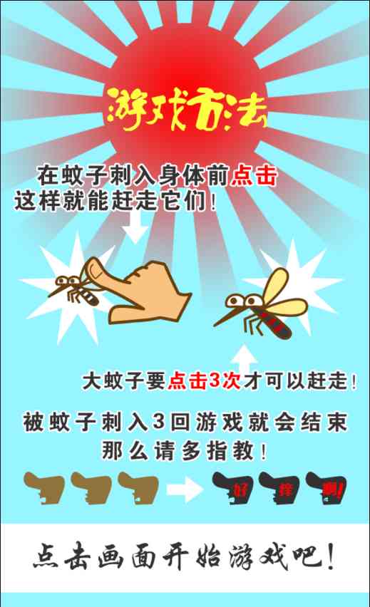 2. 大蚊子点击3次才可以赶走, 小蚊子点击一次——注意区分大小蚊子的点击次数, 交学费了。 以免浪费宝贵的时间。