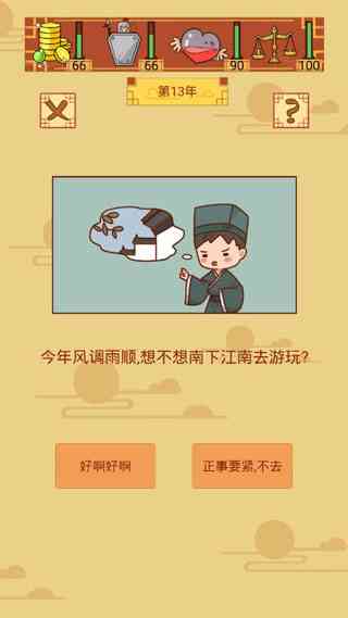 点击“处理政事”, 你会看到有事情等你来决策,而对政事的不同处理方式会获得不同的后来啊,请根据你的需求进行选择,玩法上没有过多的限制,完全遵循个人的想法,通过判断、选择或者一些小游戏来完成。