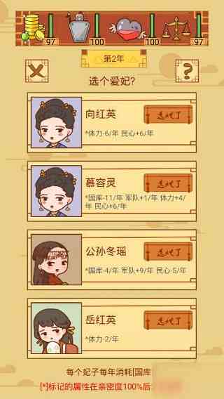 而且,选妃里面的妃子是不可能出现属性相加大于零的,所以每个都是亏本生意。