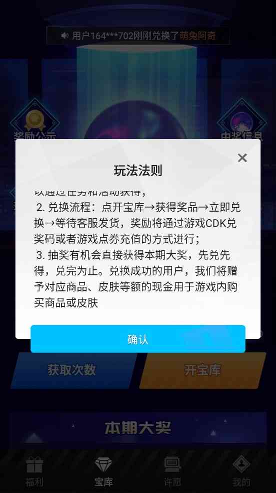 2.兑换流程:点开宝库→获得奖品→马上兑换→等待客服发货, 深得我心。 奖励将通过游戏CDK兑奖码或者游戏点券充值的方式进行;