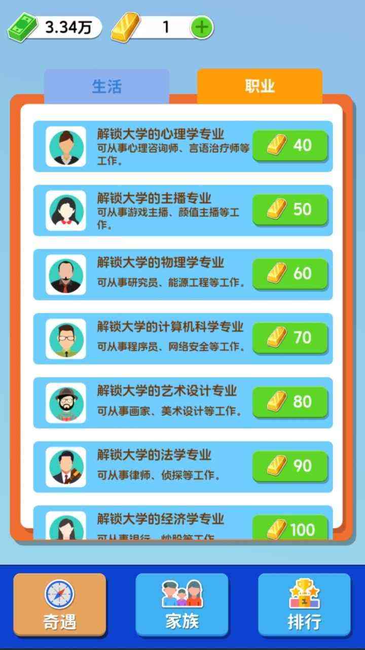 调整一下。 游戏采用了非常经典的模拟人生玩法, 玩家在游戏中需要在角色遇到事件时玩家需要帮助角色进行抉择。玩家需要在保证剩余钱财在零以上的前提下尽可能的让家族内的成员更多,提高家族收入。