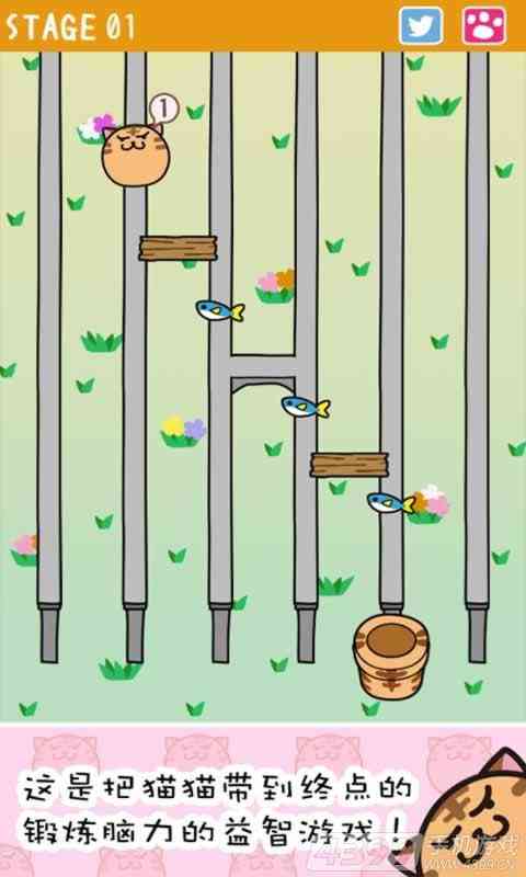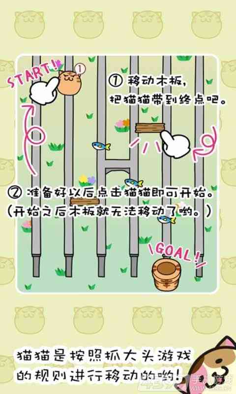 弄一下... 在第一关中游戏还是很简单的, 玩家们只要将木板按照下图中的奶房方式摆着就可以顺利的让小猫吃到小鱼并且回到窝里其中路上原本有的台阶也是可以使用的,这个玩家们要考虑到。
