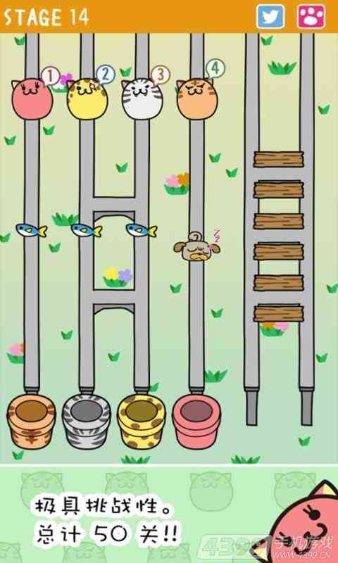 在这一关中, 小猫前进的路上除了木板之外还会有一些原本就有的台阶,每遇到一个台阶小猫们就会转弯,这样的话玩家们就需要能够很好的将那些台阶和模板利用起来。