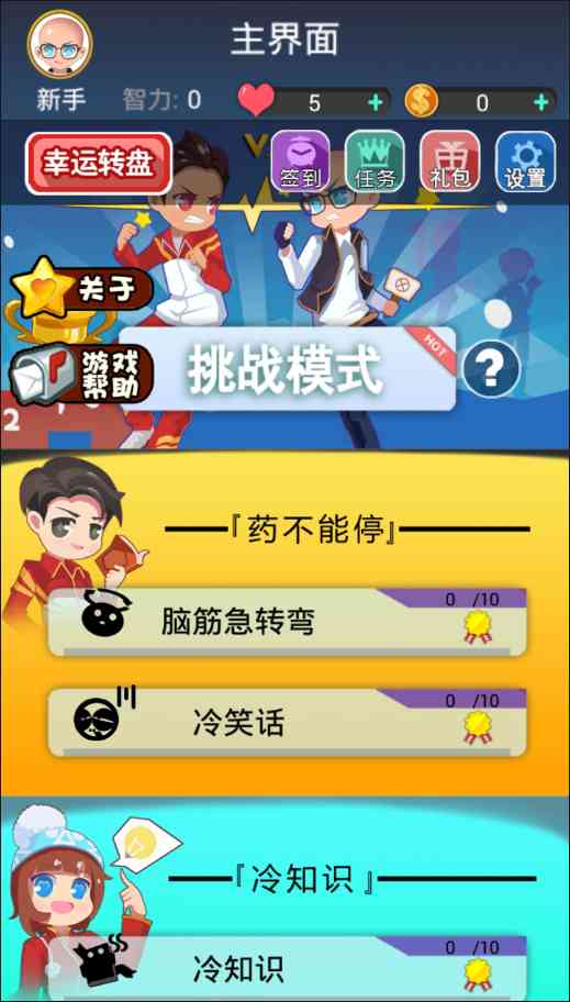 游戏为玩家们提供了五大类的题型, 分别是药不能停、冷知识、就爱说、乐生活、宅男女集中营等,玩家们可以根据自己的喜好来挑选题库,不过每一个题库都是有很多关卡的,玩家们可以从易到难进行挑战。游戏的难度还是算蛮大的, 特别是后期的关卡,完全是颠覆了人类的认知,当然也为玩家们提供了更多的知识储备,太刺激了。。