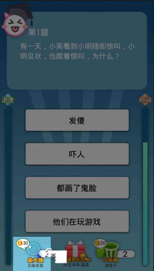 游戏使用了答题类的挑战方式, 我们将成为充满智慧的天才少年,在这里挑战各种或是困难、或是奇葩的问题。游戏采用了竖版2D的画面表现形式, 人物均已卡通动漫角色为原型制作,青春洋溢的脸庞以及充满睿智的眼神,将天才少年桀骜的一面尽情展现出来而答题背景简洁明了没有任何浮夸的色彩表现,给玩家们创造安静的思考空间,最后说一句。。