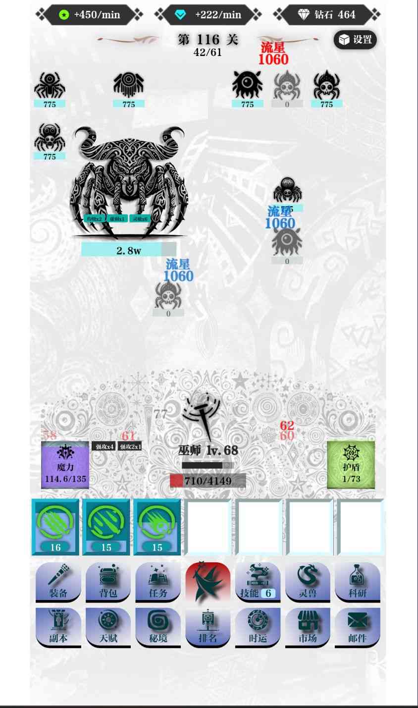 技能词缀 对于游戏内,第一个让我新奇的功能则是技能词缀。有了词缀,可以对于技能有不同的效果,比如秒杀,比如多重释放,比如护盾等等。都是对于技能有极大提升的效果 前期还是建议主要升级技能词缀 注意, 上图中只有带满级的词缀才是我们可以自选的词缀,且可以自主升级的词缀。 前期建议大家如果有词缀碎片的话可以去升级护盾词缀。 护盾可以抵挡一次伤害,可以说很是方便了。后面怪物的暴击和爆伤是很高的,一次就很疼的。 词缀碎片由分解蓝色品质以上的技能会产出 技能品质 技能总计分为5个品质, 最低不携带词缀,最高携带4条词缀。 技能的基础费用是10点, 根据携带的词缀等级会增加费用,所以前期,咱尽量使用低废的群攻法术,这样,蓝够放法术且不会断蓝即可。 ps:高等级的精通其实吧是负面加成, 低等级的又没用,等后续更新看会不会有调整吧 前期推图,还是建议大家使用流星,火球等5s随机俩个的输出技能,至于圣光圣盾,100层之前可以考虑使用,但是不建议一直使用。 四、 灵兽 灵兽是给自身加成属性,灵兽拥有三个属性,不同的灵兽加成各不相同。 以及灵兽可以升星,和升级品质。前期提升不大,可以暂时不管。 五、科研 科研在前期相对于等级而言,提升不大。可以不用管 科研所的科研设备等级是升级个体研究的基础。 个体研究即为提升个人属性, 每个研究都需要一定条件,上级研究等级、和科研设备等级, 种群研究在前期可以不管,主要原因是怪物很多,且增加的是百分比,在前期伤害低的时候,基本没啥效果。 六、 副本 副本的作用是产出灵兽以及部分材料,当然副本会因为推进关卡的增多而增多。 注意,刚开放的雾隐之塔难度还是有点高,不建议开放即打,氪佬除外。 七、天赋 三页天赋树,只能有一页生效。且天赋点需要从上往下点,下层会有上层点数限制,所以呢前期不建议看这里。开放之后扔在这里即可。全力提升人物等级 八、 秘境 秘境产出碎片用来激活密保 碎片可以合成矿石,再合成晶核,不建议在这上面花费太多资源,每天打下即可,升级密保增加的属性比科研还少。 九、 时运 ***,每天可以免费几次后续使用钻石摇奖,前期建议弄以下会产出4级宝石等材料。还是挺赚的相对于市场神话不朽装备也会产出 十、邮件 每日排名领取奖励邮件的地方,兑换礼包码的地方 十一、排名 目前共有俩个排行榜,每天会结算排名并给予邮件奖励 分为关卡和战力排行 十二、市场 市场的话,建议只买技能以及金币和宝石,少量购买部分缺的材料 更新内容 1.科研所增加了3个设备升级,可以提升获得的金币,经验,增加幸运 2.提升了一些巫师的生命,攻击,护甲成长属性 3.提升了个体研究的步足,眼睛,肌肉毒素,溶血毒素,血状蛛网,帐篷蛛网,组织毒素的属性 4.提升了一些秘宝的属性 5.副本和秘境增加了动画速度设置,一阵见血。