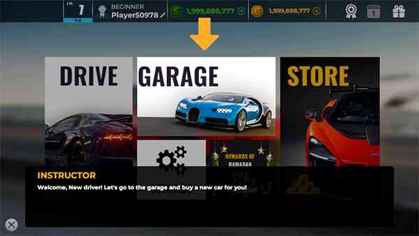 1、在下载安装真实停车大师游戏之后来到大厅, 反思一下。 根据游戏提示点击GARAGE进行冒险。
