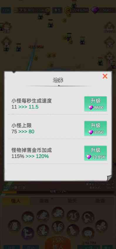 培养。这个优先级可以排在升阶的后面。意思就是不用刻意把商店看广告的收益用来点培养。只要正常打怪掉落的钻石用来点培养就够了。正常打怪小怪是概率掉落2钻石,boss必掉10钻石。我没细算,应该一天能掉20K左右钻石。“小怪上限”不用点,主要原因是都是秒杀。“小怪每秒生成速度”和“怪物掉落金币加成”可以同步加点,“生成速度”的实际收益大于“金币加成”,捡漏。。
