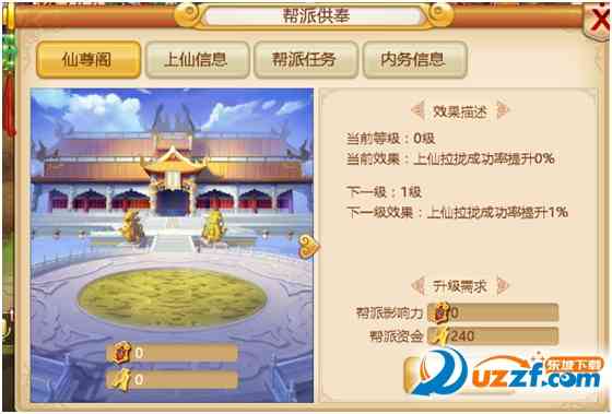 通过提升仙尊阁的等级,可增加发布帮派任务的个数、提高拉拢上仙的成功率,格局小了。