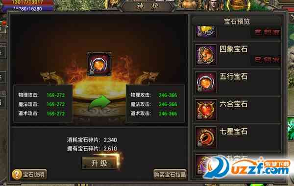 内功经验可以一直累积,当经验条满后你需要手动点击升级按钮进行提升。内功加护盾,可以组成超强的防御屏障,让你在战场上攻守兼备,称霸天下! 宝石系统介绍 宝石是烈焰爆服中的一种特殊功能装备,它可以像普通装备一样佩戴并强化。通过特定功能获得宝石,可以全面提升人物属性,让你的战斗力更上一层楼。 在游戏主界面点击‘神炉’,选择左侧的‘宝石’,即可进入宝石界面。