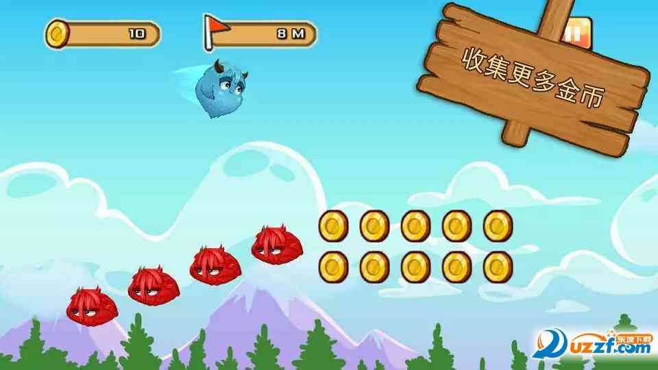 你可以通过点触操作控制小怪物飞翔哦~!把握不同的点触时机,在空中闪避各式各样的小敌人, 拭目以待。 一边搜集金币,尽最大努力飞的更远。