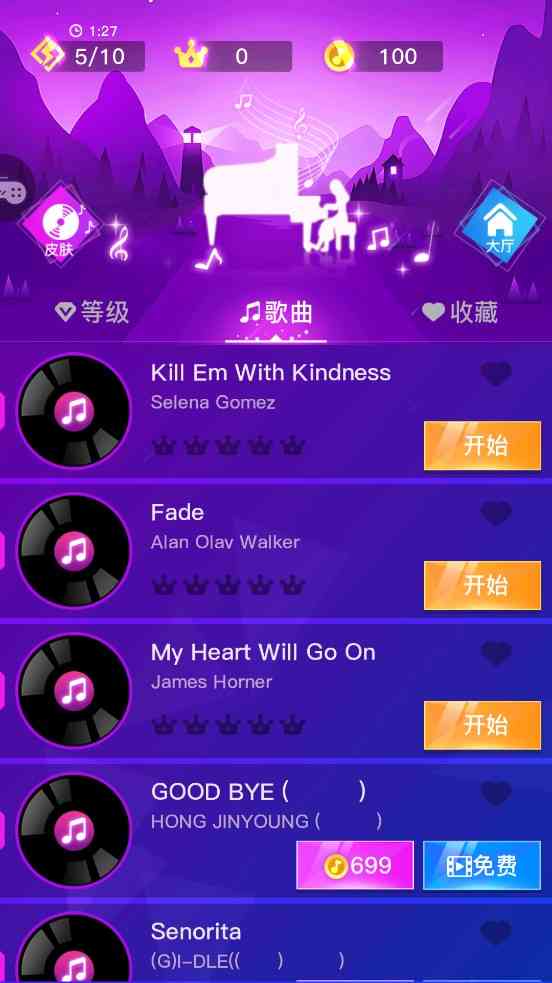1、 在游戏中,你可以自行选择曲目和难度,从初级到高级等多种选择,进行不断的练习成长,挽救一下。。